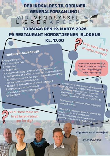 Vil du være med til at sætte retning? Og høre mere om, hvad lærerkredsen gør for dig? Så mød op til ordinær generalforsamling i Midtvendsyssel Lærerkreds den 19. marts 2026