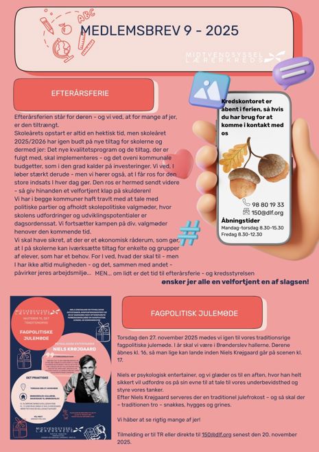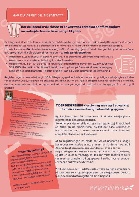 Medlemsbrev med efterårsferiehilsen, ny dom for deltidsansatte med opgjort merarbejde, opgaveoversigter og tidsregistrering
